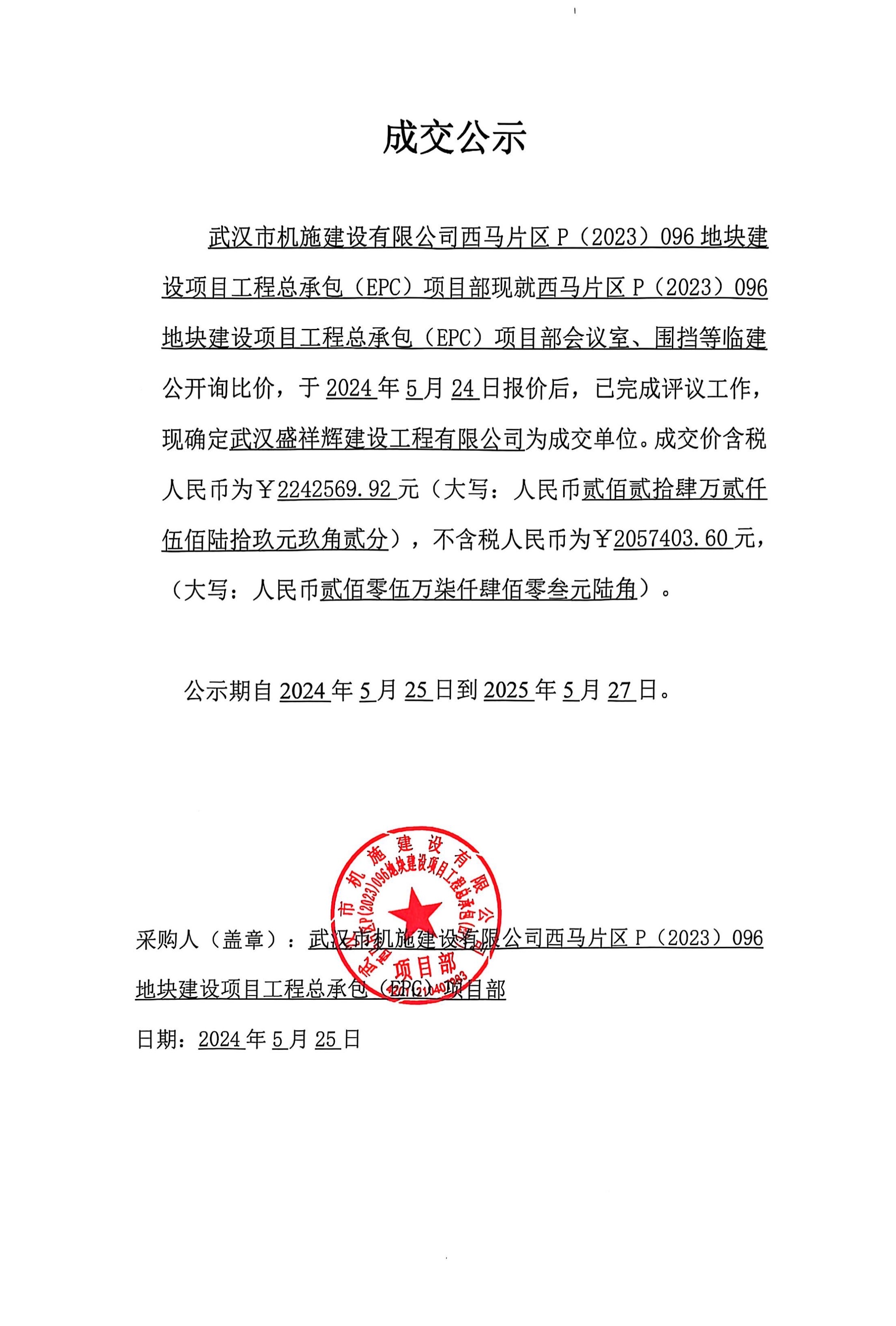 武漢市機(jī)施建設(shè)有限公司西馬片區(qū) P(2023)096 地塊建設(shè)項(xiàng)目工程總承包(EPC)項(xiàng)目部會議室、圍擋等臨建成交公示