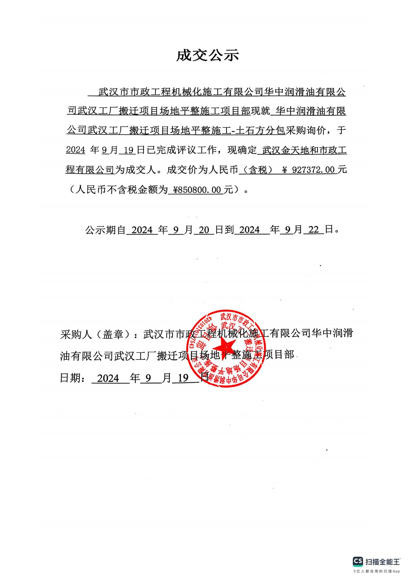 華中潤(rùn)滑油有限公司武漢工廠搬遷項(xiàng)且場(chǎng)地平整施工土石方分包成交公示