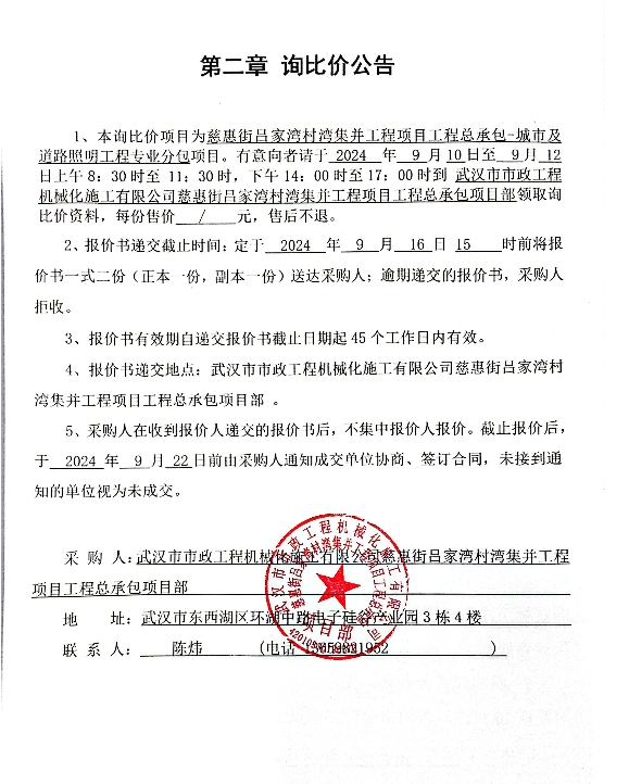 慈惠街呂家灣村灣集并工程項(xiàng)目工程總承包-城市及道路照明工程專業(yè)分包詢價(jià)公告