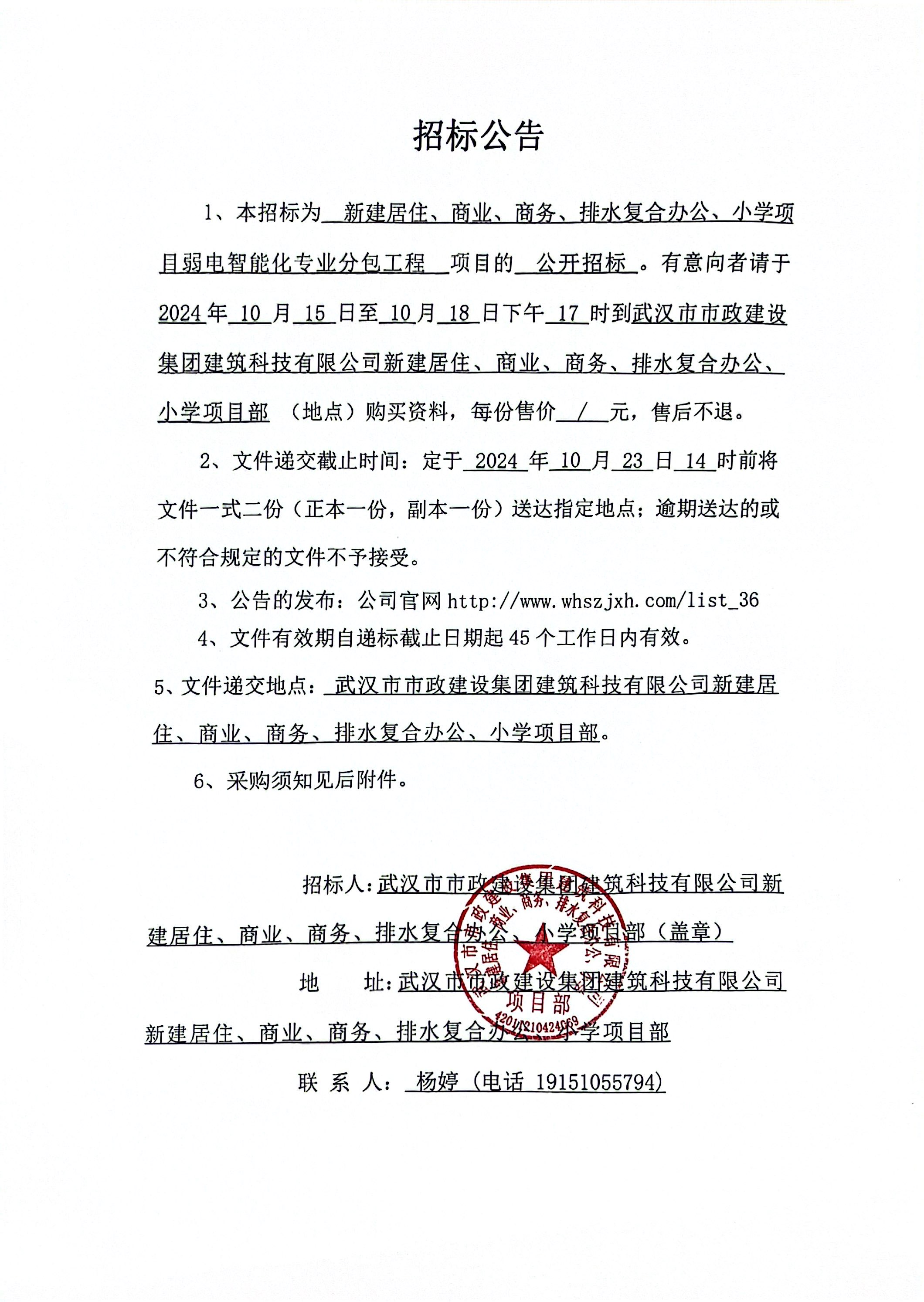 武漢市市政建設(shè)集團(tuán)建筑科技有限公司新建居住、商業(yè)、商務(wù)、排水復(fù)合辦公、小學(xué)項(xiàng)目弱電智能化專(zhuān)業(yè)分包工程招標(biāo)公告