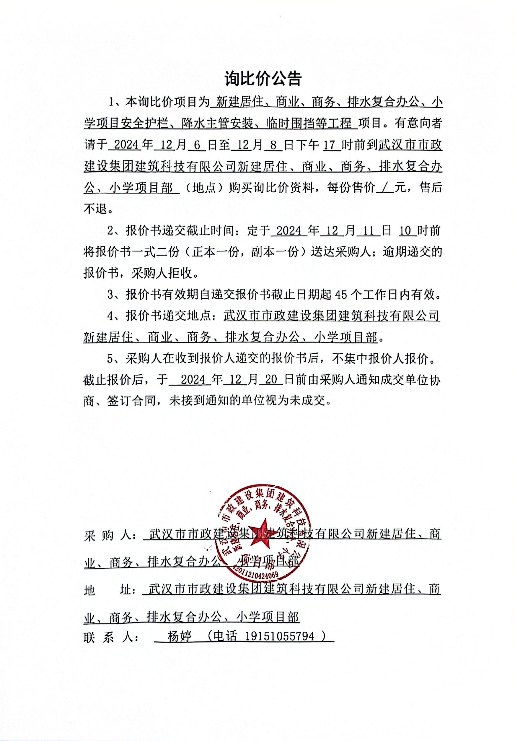 武漢市市政建設集團建筑科技有限公司新建居住、商業(yè)、商務、排水復合辦公、小學項目安全護欄、降水主管安裝、臨時圍擋等工程詢比公告